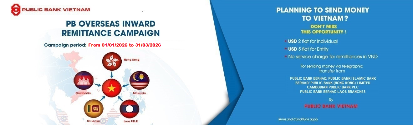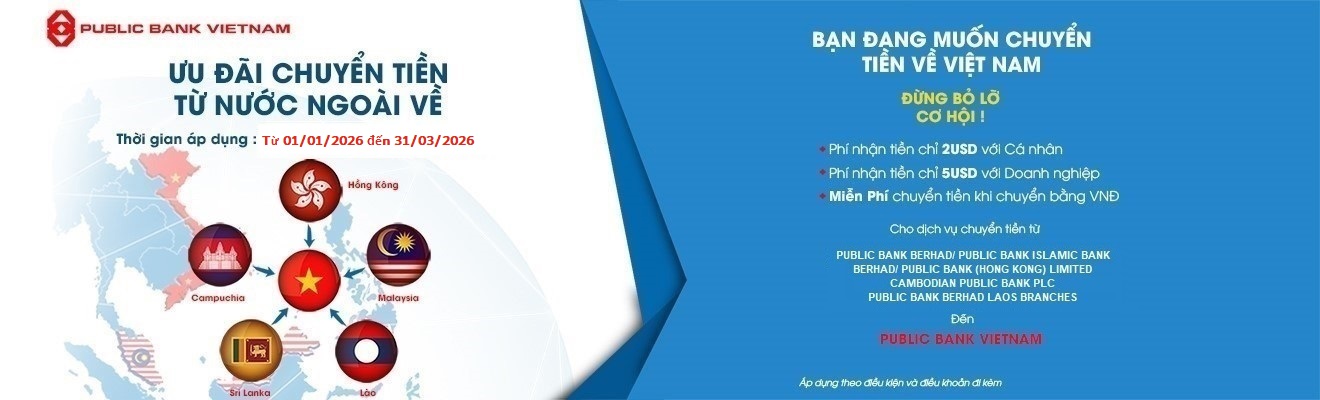 Khách hàng có tài khoản thanh toán tại PBVN sẽ được hưởng ưu đãi hấp dẫn với mức phí cố định chỉ 2 Đô la Mỹ đối với cá nhân và 5 Đô la Mỹ đổi với tổ chức khi chuyển tiền từ các ngân hàng trong hệ thống Public Bank tại Malaysia, Hồng Kông, Lào, Campuchia và Sri-Lanka tới PBVN trong thời gian diễn ra chương trình.