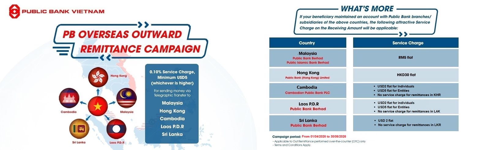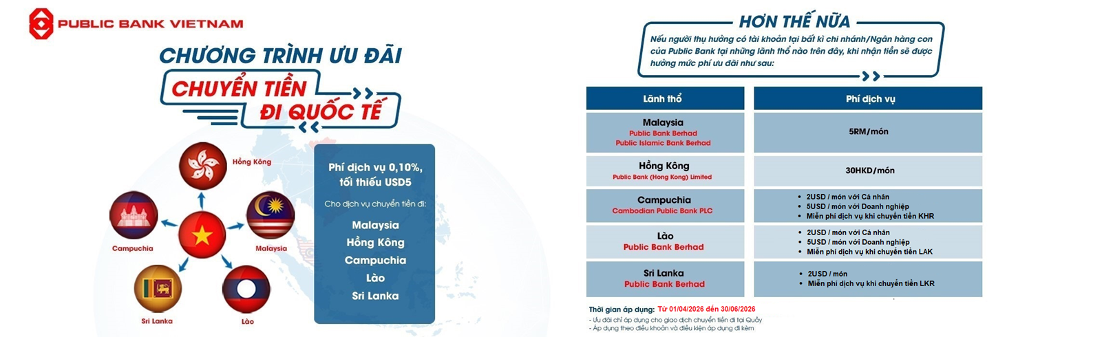 Khách hàng có tài khoản thanh toán tại PBVN sẽ được hưởng ưu đãi hấp dẫn với mức phí 0.1%, tối thiểu 5 Đô la Mỹ khi chuyển tiền tới các ngân hàng trong hệ thống Public Bank tại Malaysia, Hồng Kông, Lào, Campuchia và Sri-Lanka trong thời gian diễn ra chương trình.